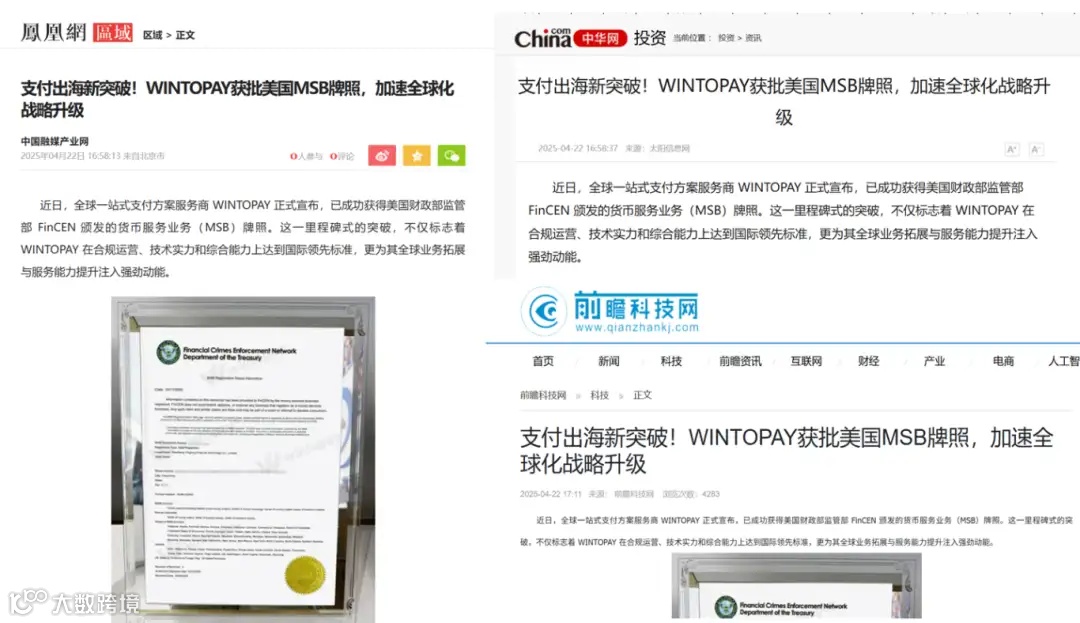 获得MSB牌照的WINTOPAY,凭借用户友好的创新产品、稳健的银行及金融机构合作伙伴关系,以及完善的合规体系,将赋能企业提升本地化运营能力,以及有机会去链接更多全球商机。亮眼的表现获得了凤凰新闻、中华网、前瞻科技网等多家行业权威媒体也第一时间聚焦报道。