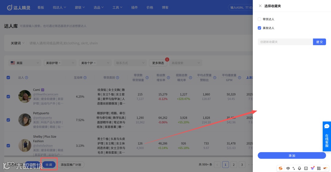 ③分类管理达人资源:勾选达人后,可直接添加至收藏夹/推广计划,后续复用更高效。