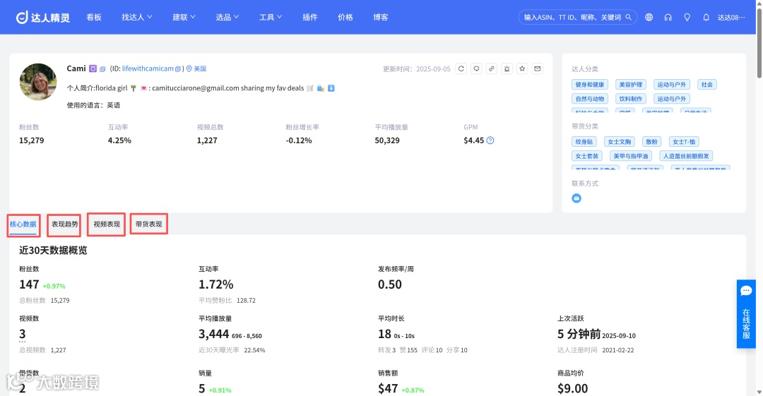 点击查看详情,还能看到该达人核心数据、表现趋势、视频表现等多维数据,帮你深度精准评估达人匹配度。