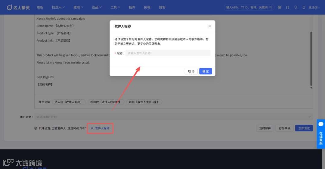 在邮件编辑页底部,把「发件人昵称」修改为个性化名称,达人在收件箱能直接看到,亲切感拉满;