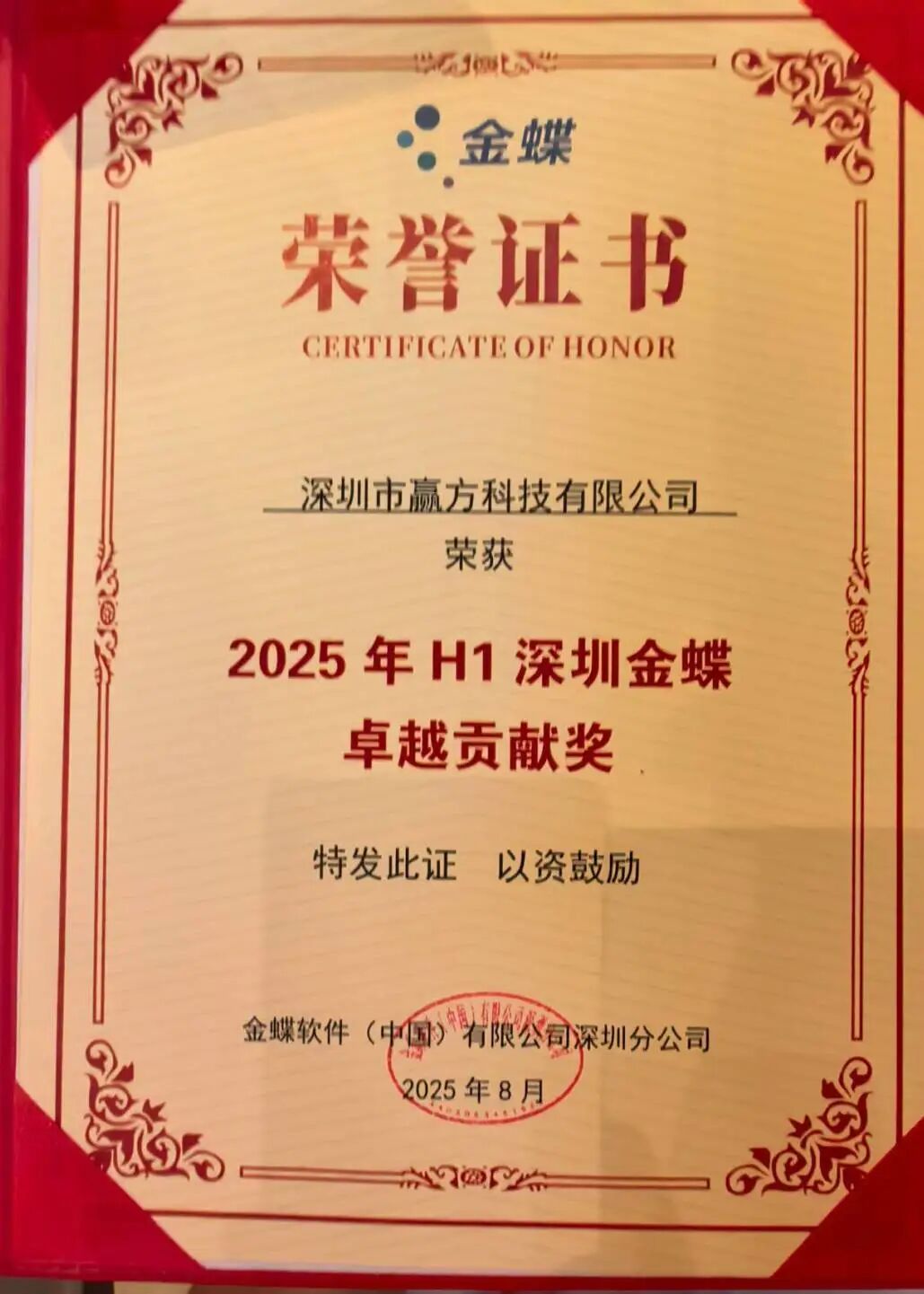 除了全国性奖项,凭借在区域市场的点滴积累与付出,赢方科技还夺得2025年H1深圳金蝶卓越贡献奖。作为扎根深圳的企业,我们始终关注本地客户的数字化需求,积极配合深圳金蝶推进区域服务网络建设,助力本地企业加速转型。这份区域奖项,是对我们深耕本地市场、践行服务承诺的鼓励。