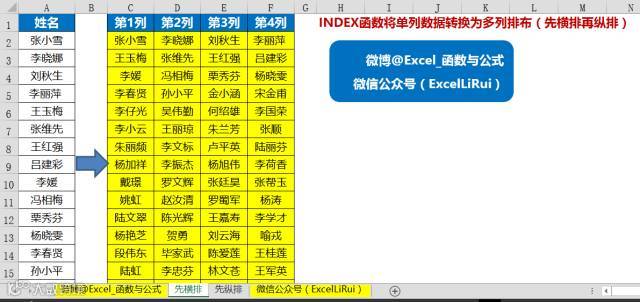 将一列姓名数据转为每行4个姓名的布局,便于打印: