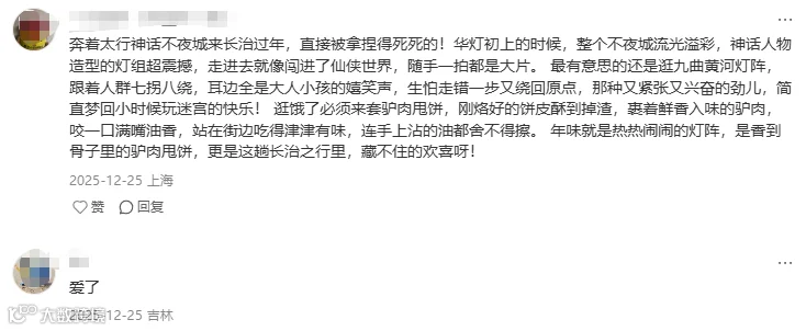 📍长治:太行山下,长治的新年揉进了古朴与奇幻的色彩。振兴小镇红灯高挂,太行神话不夜城光影流转,潞安府城隍庙古色古香,三者勾勒出太行深处的年味图景。流淌在血脉里的民俗基因在此刻尽数绽放:民间社火的欢腾锣鼓、九曲黄河灯的神秘祈福、上党八音会的激昂旋律,每一项都承载着太行山区的文化记忆。舌尖上的年味同样地道,长子猪头肉的醇香、武乡枣糕的香甜、驴肉甩饼的酥脆,一口下去满是岁月沉淀的美妙滋味。