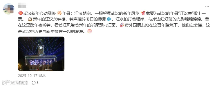 📍武汉:古今交融的景致里,藏着武汉最地道的新年韵味。黄鹤楼巍峨矗立、江汉关钟声悠扬、木兰不夜城灯火璀璨,三者相映成趣,勾勒出这座城市的独特轮廓。传承千年的民俗更添年味:汉口里南派醒狮腾跃起舞,归元寺庙会香火缭绕,园博园灯会流光溢彩,每一幕都透着浓郁楚韵。而热气腾腾的藕汤、香脆的油炸圆子、焦香的豆皮,更是刻在武汉人记忆里的新年味道,一口便暖透心间。