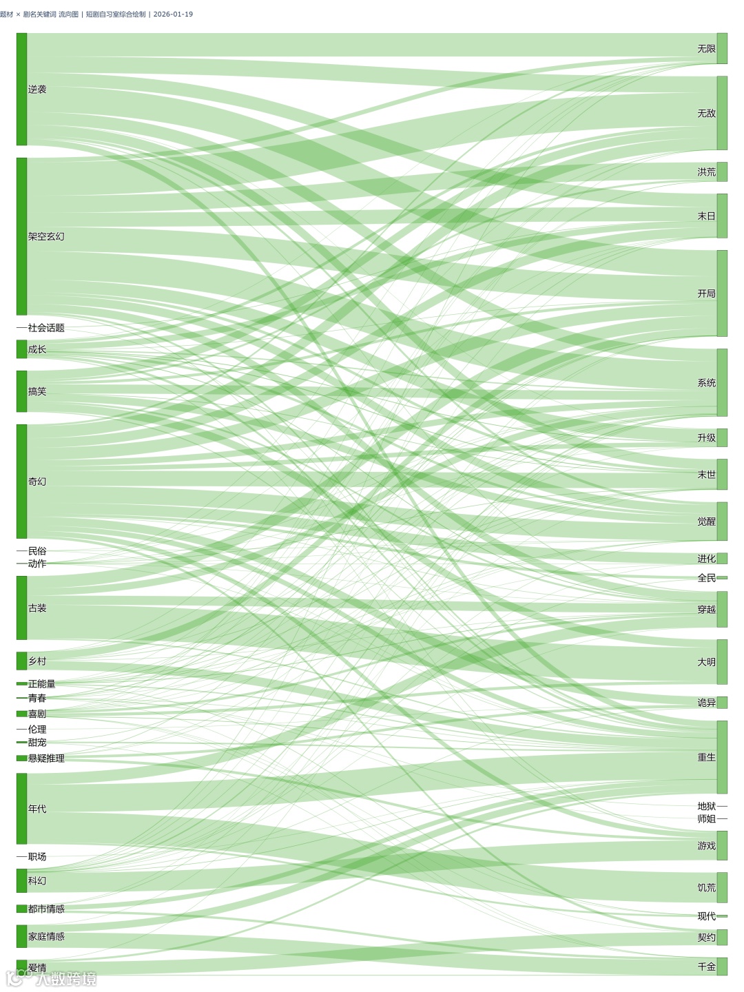 PS:流向图左边为播放量较高的漫剧题材标签,右边为相关漫剧剧名里出现的高频关键词,连线粗细代表「题材x关键词」组合对应剧的播放增量总和有多大,越粗越“能打”。