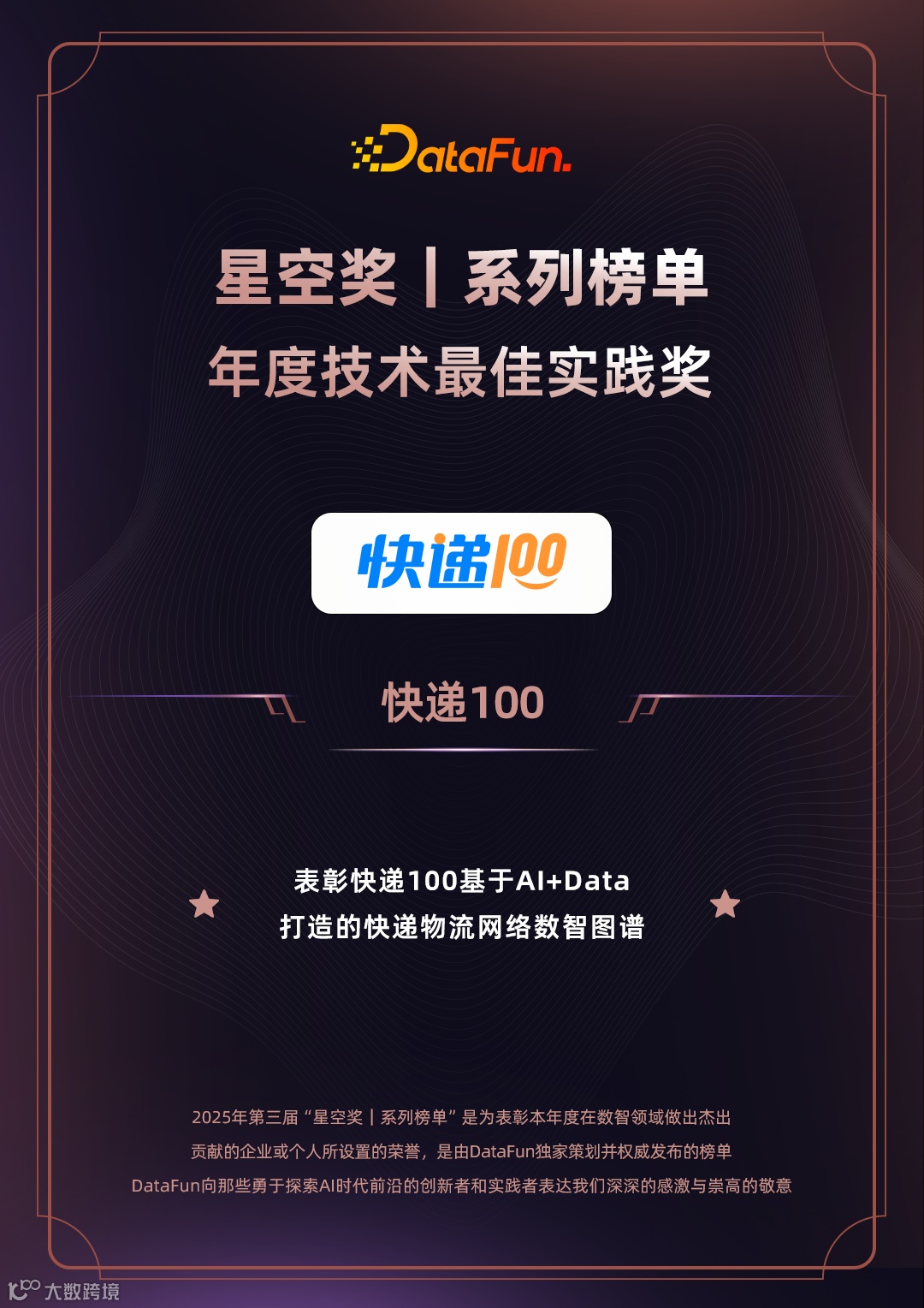此次荣膺DataFun“星空奖·年度技术最佳实践奖”,既是对快递100硬核AI+Data技术实力的权威认可,更印证其深入垂直行业、解决真实业务痛点、创造可验证商业价值的标杆能力。
