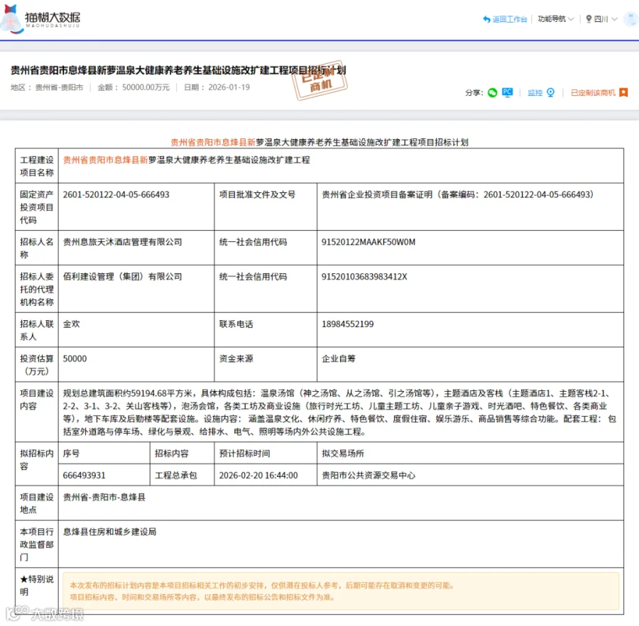2026年1月19日,贵州省招标投标公共服务平台发布了《贵州省贵阳市息烽县新萝温泉大健康养老养生基础设施改扩建工程项目招标计划》。该项目总投资5亿元,涵盖温泉汤馆、主题酒店、泡汤会馆及商业配套设施建设,为建筑行业相关企业提供了丰富的商业机会。