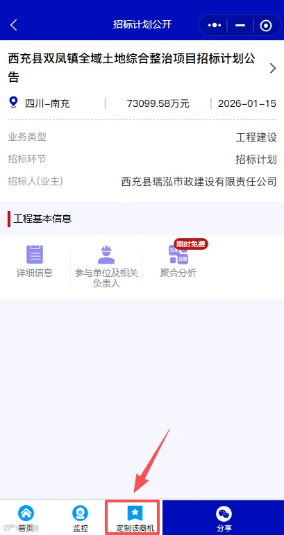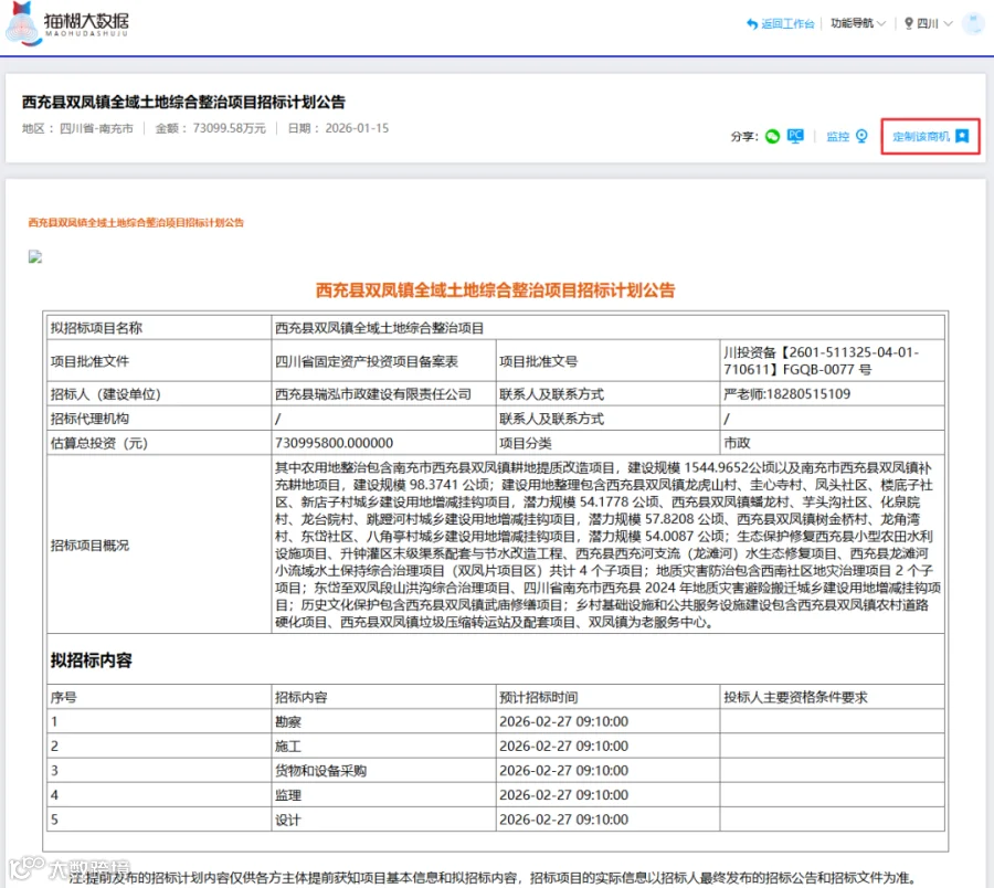 2026年1月15日,南充市公共资源交易中心发布了西充县双凤镇全域土地综合整治项目招标计划公告。该项目总投资7.3亿元,涵盖农用地整治、建设用地整理、生态保护修复、地质灾害防治、历史文化保护及乡村基础设施等多个领域,为建筑行业相关企业带来了丰富的商业机会。