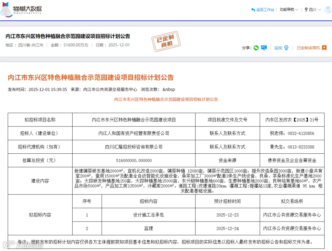 2025年12月1日,四川省公共资源交易信息网发布《内江市东兴区特色种植融合示范园建设项目招标计划公告》。该项目总投资5.16亿元,涵盖特色种植基地、农产品加工、基础设施改造等多领域建设内容,为建筑、农业、设备供应等相关企业带来丰富的商业机会。
