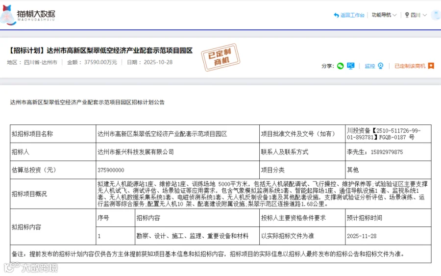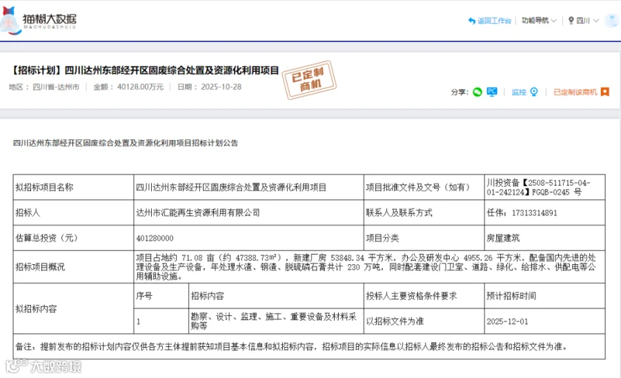 2025年10月28日,达州市公共资源交易服务中心集中发布了四川达州东部经开区固废综合处置及资源化利用项目、达州市高新区梨翠低空经济产业配套示范项目园区两大重点项目的招标计划。这两大项目总投资分别达4.0128亿元和3.759亿元,涵盖了固废处理、低空经济产业配套等多个领域,为建筑行业相关企业提供了丰富的商业机会。