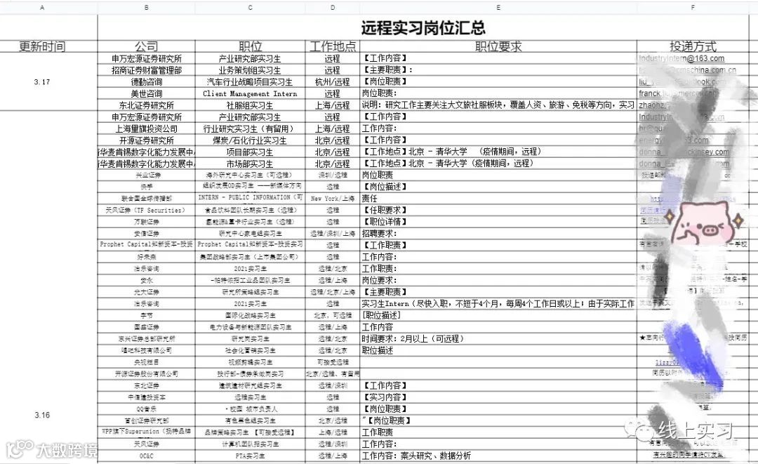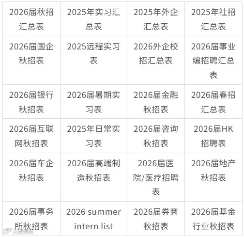 2:我们会定期整理汇总表,分时间:春招/秋招网申汇总表、寒暑假实习信息汇总表、远程实习信息汇总表等...分行业:国企央企汇总表/金融/咨询/互联网/事务所/快消岗位汇总表/国家部委招聘信息等等,每周第一时间分享到VIP会员群!部分展示示如下👇