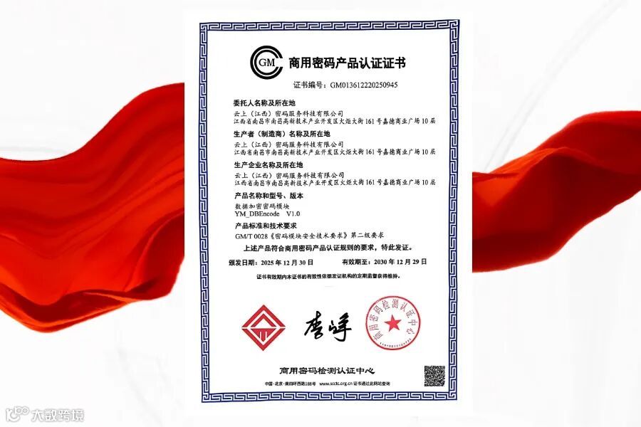近日,由江西数字集团所属企业云上密码自主研发的高性能密码设备“数据加密密码模块”经严格检测符合GM/T 0028《密码模块安全技术要求》第二级要求,顺利通过商用密码检测认证中心审查,正式获得《商用密码产品认证证书》。