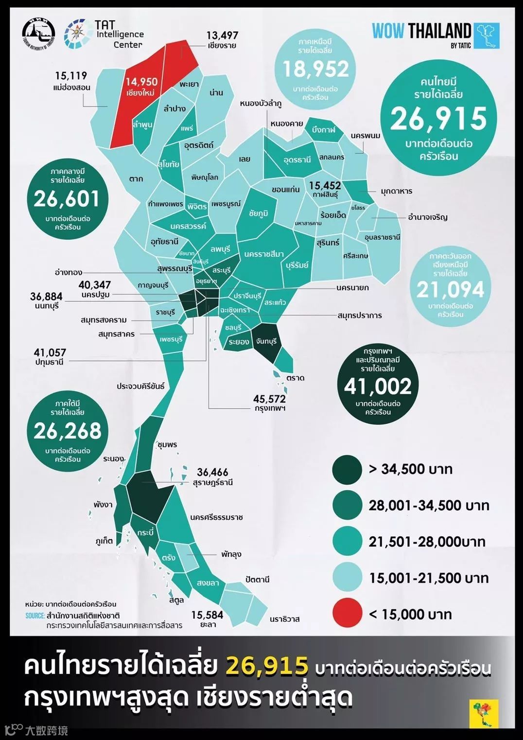 全泰国平均每户家庭月收入为26,915铢(约合人民币5400元)。其中曼谷及周边地区即巴吞他尼府、北榄府、暖武里府平均月收入最高,达到41,002铢(约8000元人民币),清莱府为表现最低区域,仅为13,497铢。