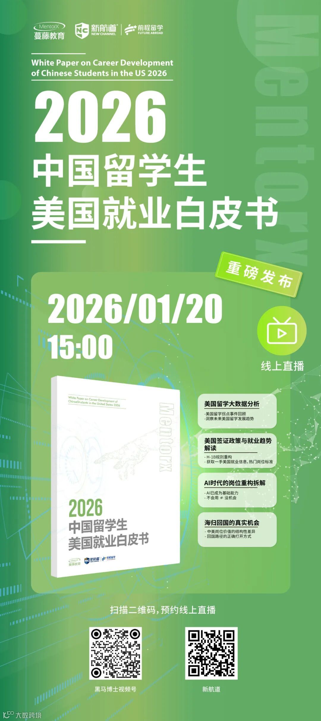《2026中国留学生美国就业白皮书》将于1月20日发布,由蔓藤教育与新航道前程留学联合撰写,这份报告并非简单的趋势预测,而是一份基于海量数据、最新政策与产业洞察的战略地图,旨在为每一位中国留学生厘清前路、锚定方向。