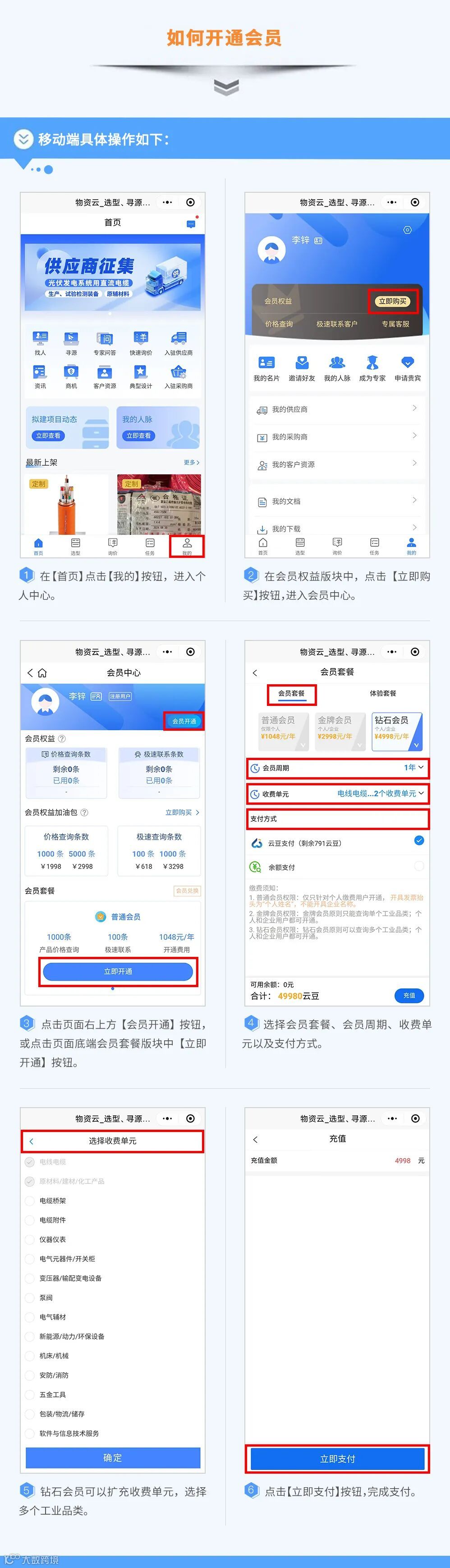 使用物资云APP或者微信小程序“物资云BOM”,按照以下视频方法操作,开通会员。
