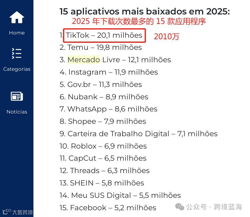 巴西正经历一场“短视频狂欢”,Tik Tok以单季度2000万次下载量登顶应用榜单,超越Temu(1980万次)和本土电商巨头美客多(1210万次)。