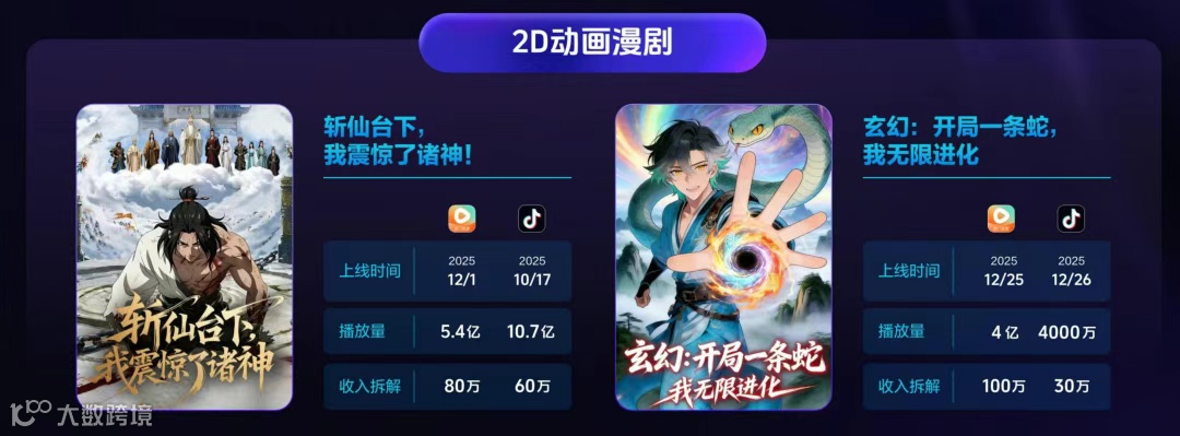 AI仿真人剧《风水之王》单平台分账高达170万;2D漫剧《玄幻:开局一条蛇,我无限进化》,一个月内获得4亿+播放量,红果加抖音130万分账。