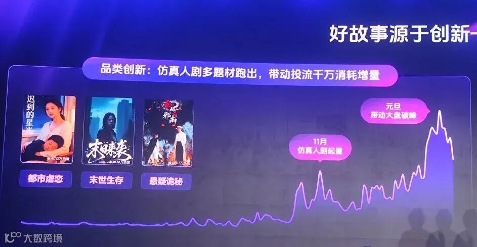 巨量引擎数据显示,仿真人剧多题材跑出,带动投流千万消耗增量——11月起量,元旦带动大盘破峰。