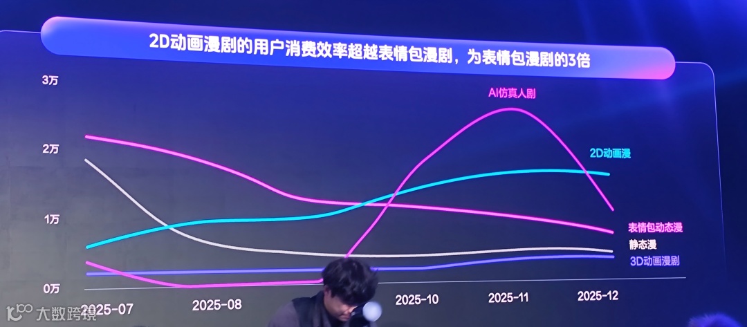 2D漫剧的用户消费效率超越表情包漫剧,为表情包漫剧的3倍;AI仿真人剧的消费效率峰值突出。