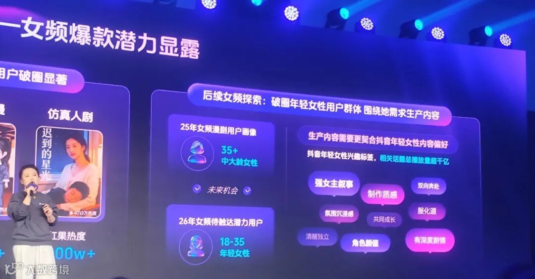 抖音年轻女性兴趣标签相关话题的总播放量超干亿:强女主叙事、氛围沉浸感、制作质感、共同成长、清醒独立、角色颜值、双向奔赴、服化道、有深度剧情。