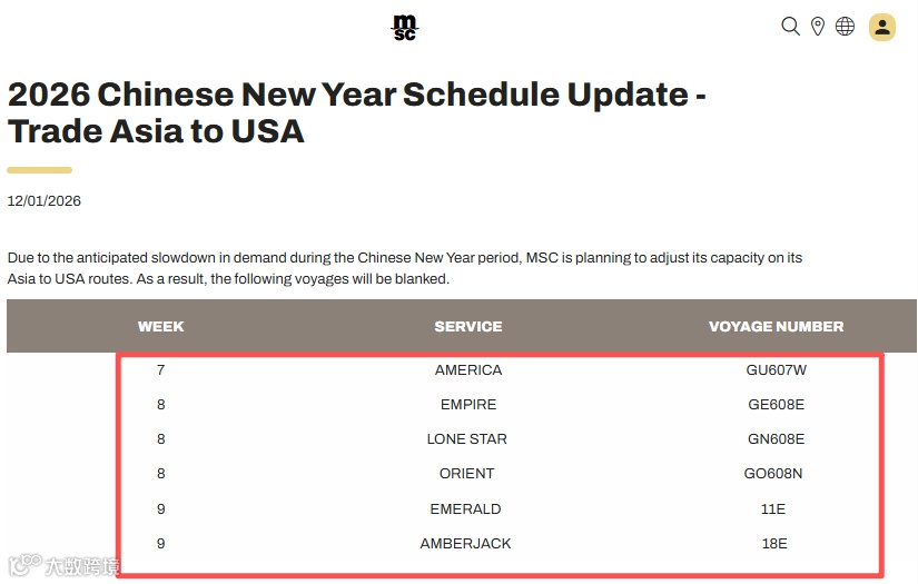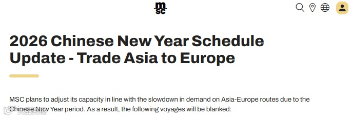 12日,MSC发布公告称,因春节期间亚洲至美国及亚欧航线需求下降,公司将对相关航线运力进行调整,部分航次将予以取消。