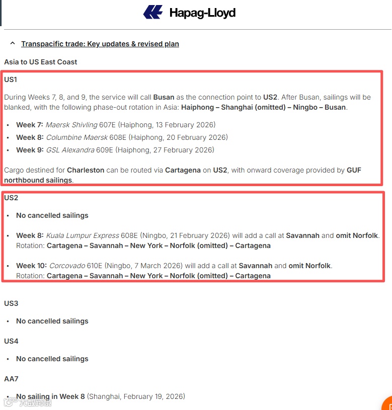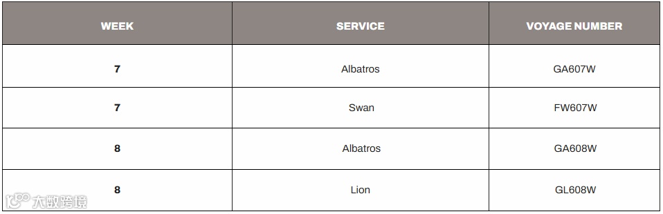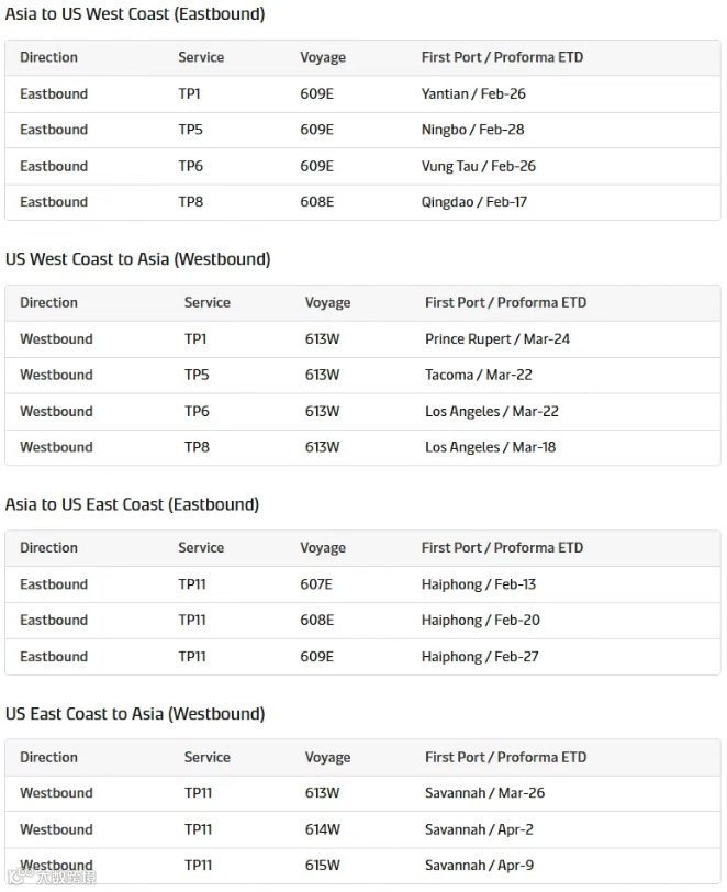 美国东海岸方面,US1航线将在第7、8、9周釜山之后终止;US2航线将在第8周停靠萨凡纳后,第10周跳过诺福克。西海岸方面,WC1、WC3和WC4将于第9周停航,WC2于第8周停航。