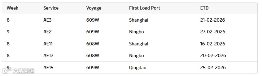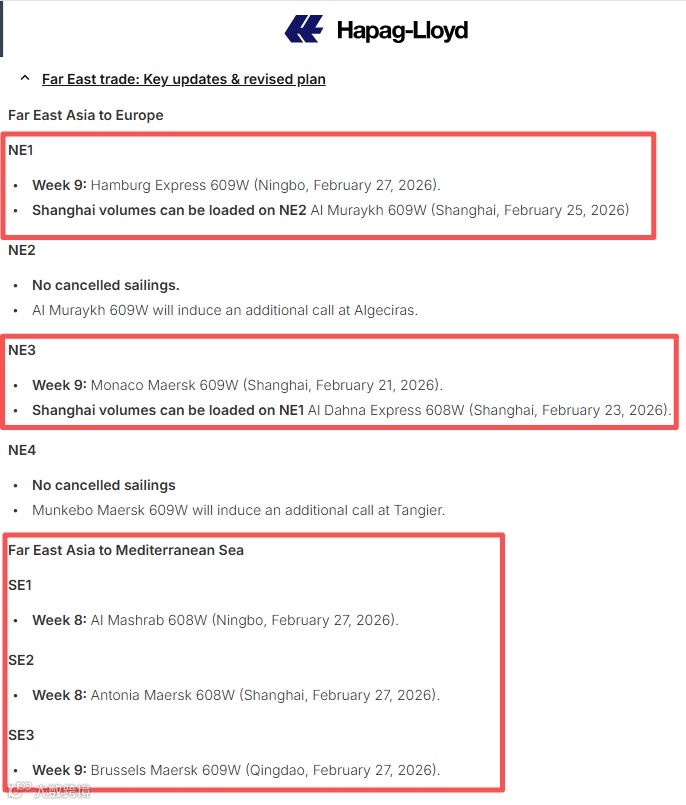 亚洲至欧洲航线中,NE1和NE3将于第9周停航,SE1和SE2于第8周停航,SE3于第9周停航。