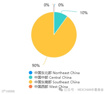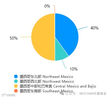 在墨西哥开展业务的公司中,中部和巴希奥地区占比最高,达到50%,东北部占比40%,两者合计占比90%,西北部占比10%,东南部暂无业务布局。建议企业在拓展墨西哥业务时,可重点关注中部和东北部市场。