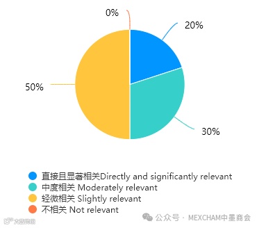 The data shows that the highest percentage of companies were slightly related, at 50%; moderately related companies accounted for 30%; and directly and significantly related companies accounted for 20%, totaling 50%; while the proportion of unrelated companies was 0, meaning that the businesses of all the surveyed companies were related to the new tariff measures to some extent.