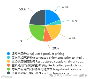 在各项应对措施中,“与客户或合作伙伴协商分摊成本”和“迄今未采取任何行动”的比例均为50%,并列最高。而“调整产品定价”和“重组供应链或采购”的比例均为40%,也是较为常见的应对方式。相比之下,“实施前加速发货”占比最低,仅为10%,“重新分类产品或审查HS编码”占比20%。