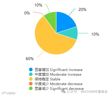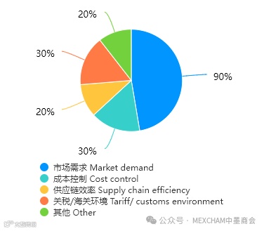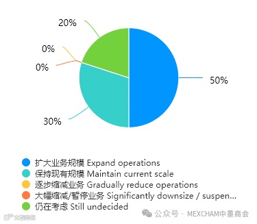 Overall, when looking ahead to their China-Mexico business adjustment plans for 2026, 50% of companies chose to expand their operations. 30% planned to maintain their current scale, 20% were still considering it, and 0% planned to reduce operations. This reflects a generally optimistic market outlook for the business's development, with no clear trend of contraction yet observed.