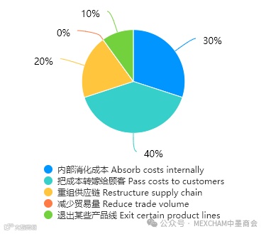 Among all the companies surveyed, the highest percentage (40%) chose "passing costs on to customers"; followed by "absorbing costs internally" (30%); "restructuring the supply chain" (20%); "exiting certain product lines" (10%); and "reducing trade volume" (0%).