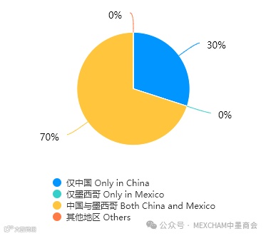 Data shows that 70% of companies choose to operate in both China and Mexico, while 30% operate solely in China, and 0% operate only in Mexico or other regions. This indicates that companies tend to cover both the Chinese and Mexican markets simultaneously in their regional strategy, with a relatively low proportion operating solely in China and no companies operating only in Mexico or other regions.