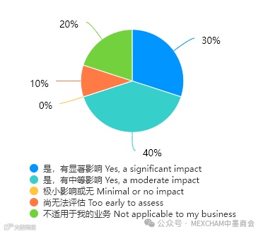 从整体数据来看,认为有显著影响的占30%,中等影响的占40%;而认为极小影响或无影响的比例为0%,尚无法评估的占10%,不适用于业务的占20%。