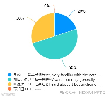 在所有调查对象中,50%的人表示听说过USMCA计划于2026年开始联合审查这一事宜,但不熟悉具体细节。仅有20%的人完全了解潜在影响,10%的人完全不知情,另有20%的人不确定或认为不适用于自身业务。