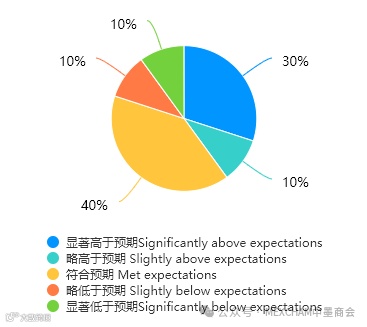 从整体表现来看,选择“符合预期”的比例最高,为40%;“显著高于预期”和“略高于预期”的比例分别为30%和10%,二者合计达40%;“略低于预期”和“显著低于预期”的比例均为10%。