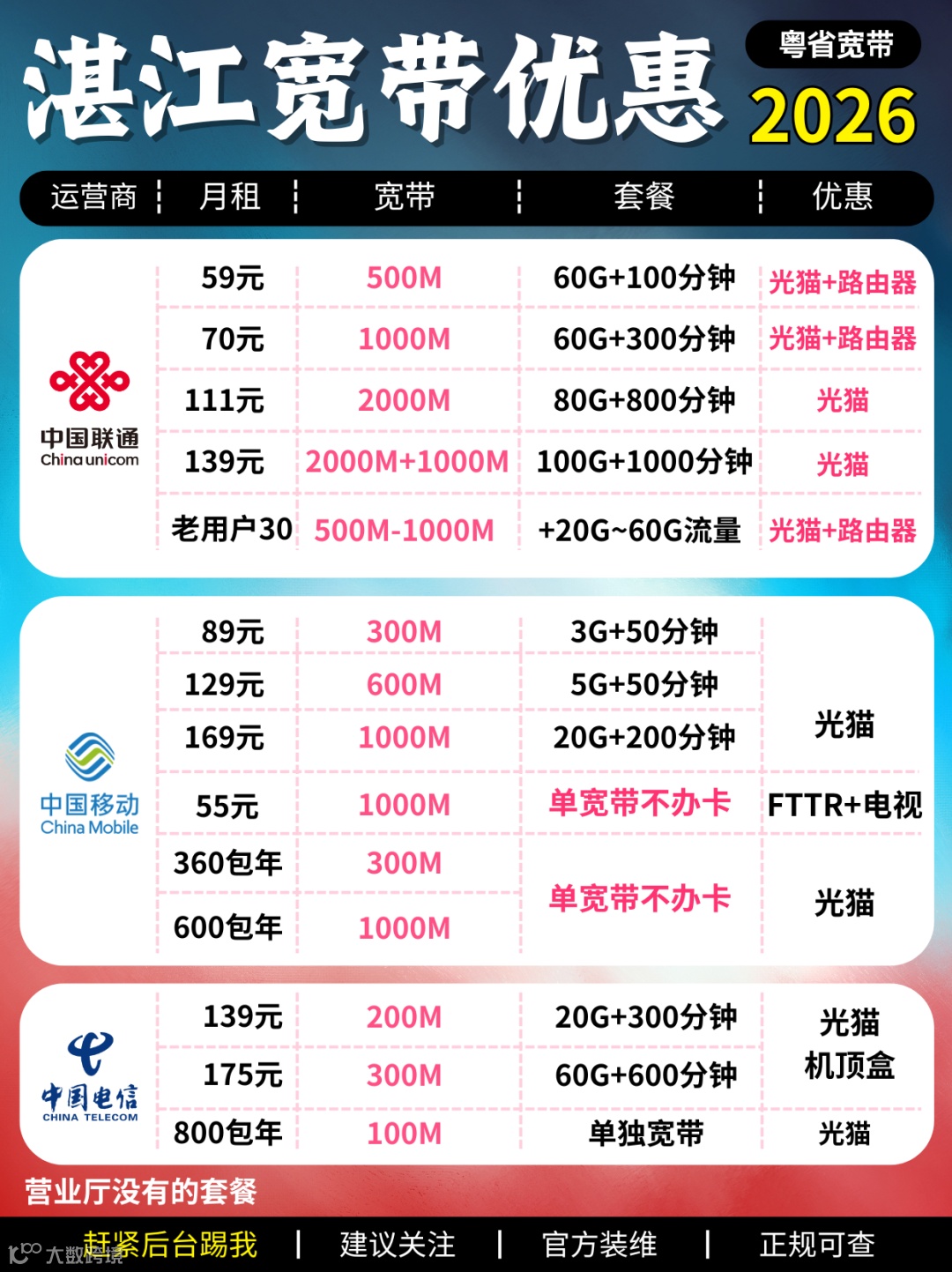 月租 70 块,升级到 1000M 宽带,配 60G 流量 + 300 分钟通话,照样送光猫 + 路由器。三口之家 —— 流量够爸妈刷短视频 + 孩子上网课,300 分钟通话能 cover 外卖快递沟通👍。