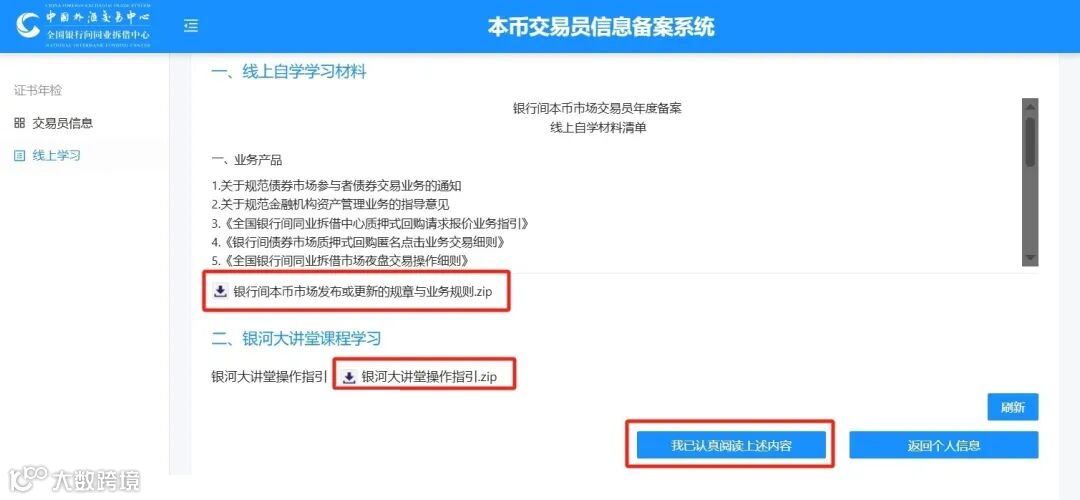 进入“线上学习”模块,下载资料包,学习银行间本币市场相关规范文件。同时登录iDeal银河大讲堂,完成货币、债券、衍生品业务实操及宏观分析类课程学习。