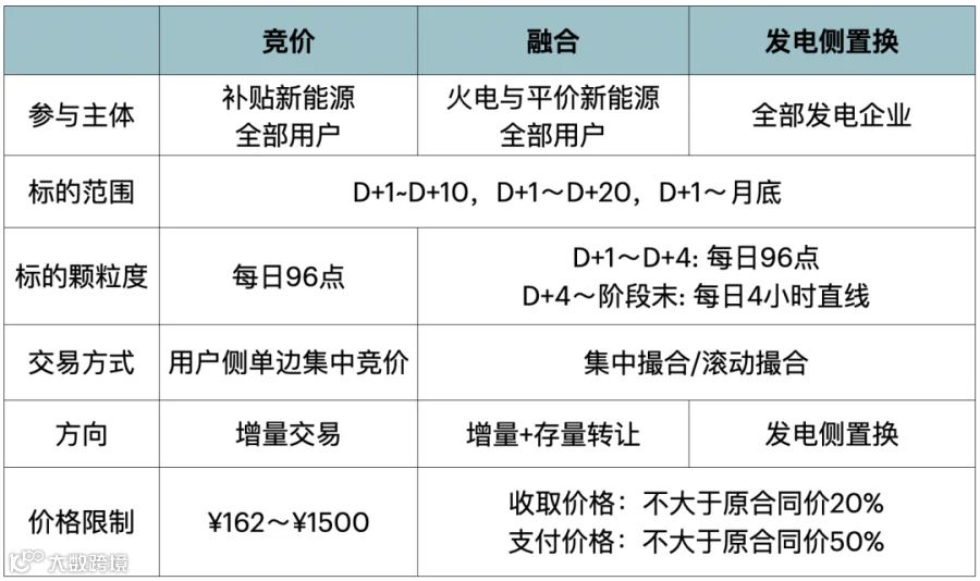 其中,月内交易分为竞价,融合和发电侧置换,对比如下