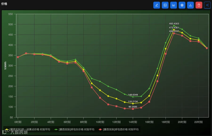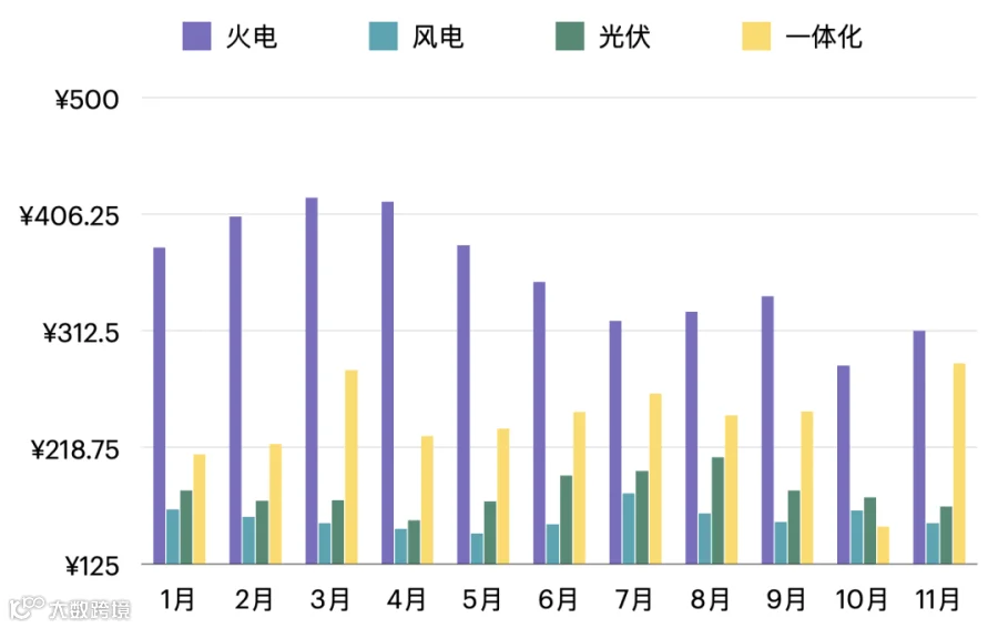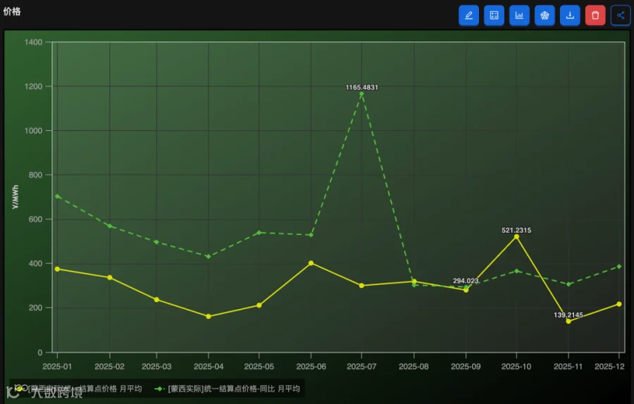 蒙西现货价格月度波动较大,以2024年和2025年为例,2024年最高价在7月 (¥1165/MWh),最低价在9月 (¥294/MWh);而2025年最高价在10月 (¥521/MWh),最低价在11月 (¥139/MWh)。