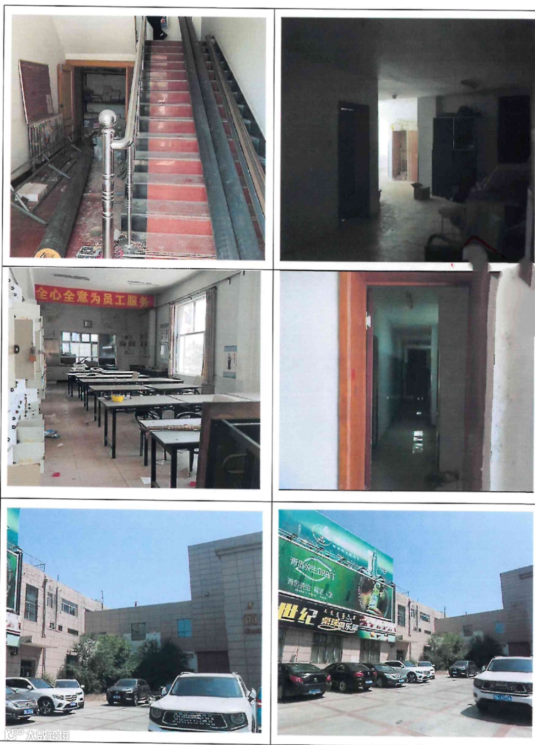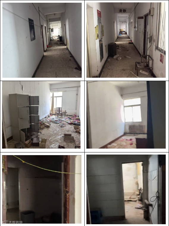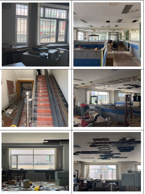 装修情况:酒店客房走廊铺设植绒地毯,外墙面贴壁纸、木质门,客房内墙贴壁纸、地面铺植绒地毯,墙面一半为木质墙裙(整体内部设施陈旧老化,部分窗户玻璃碎裂、管线断连掉落)