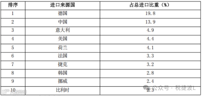 第二大进口来源国:中国(进口占比13.9%),贸易合作潜力巨大。