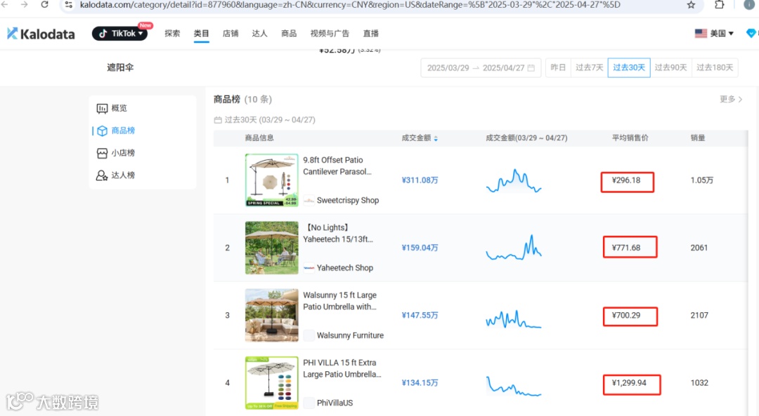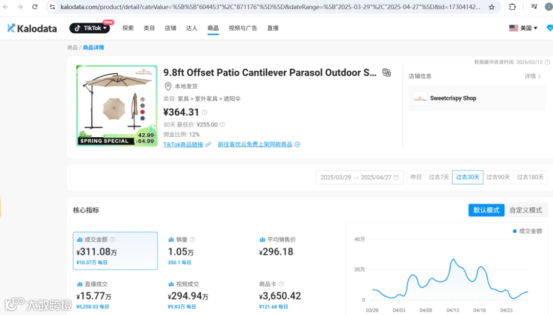 图源:kalodataSweet crispy这款遮阳伞最大优势就是其超高性价比。市面同类产品普遍售价700元以上,而它仅售价不到300元。