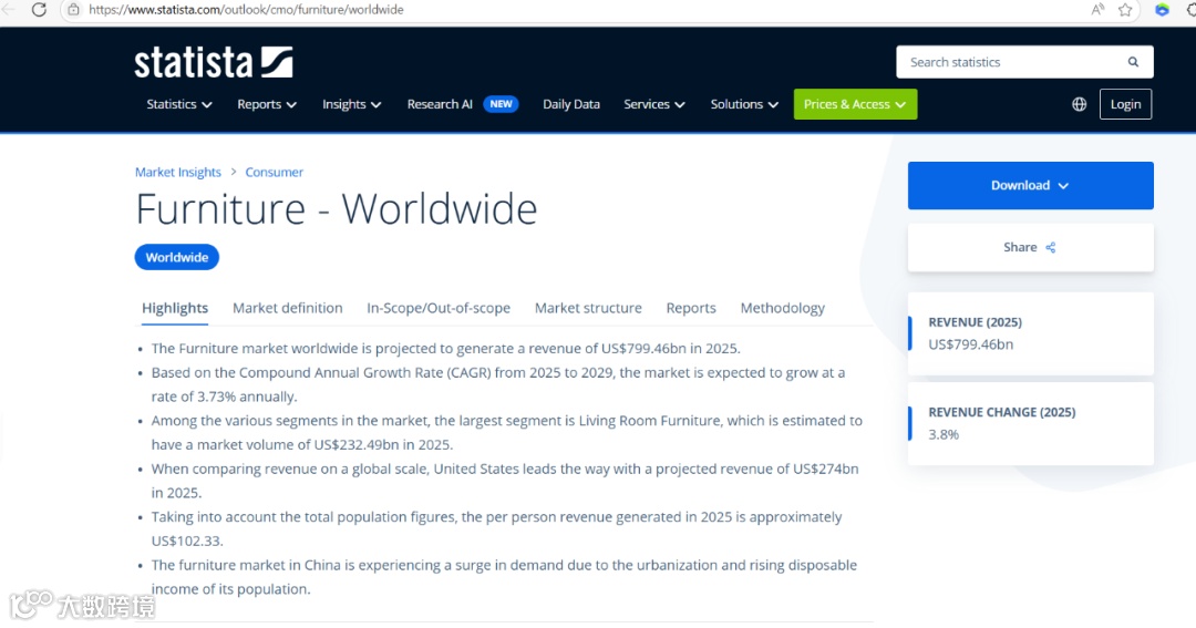 据Statista数据,2025年全球家具市场收入将达7994.6亿美元,2025-2029年期间年均增长率预计为3.73%。