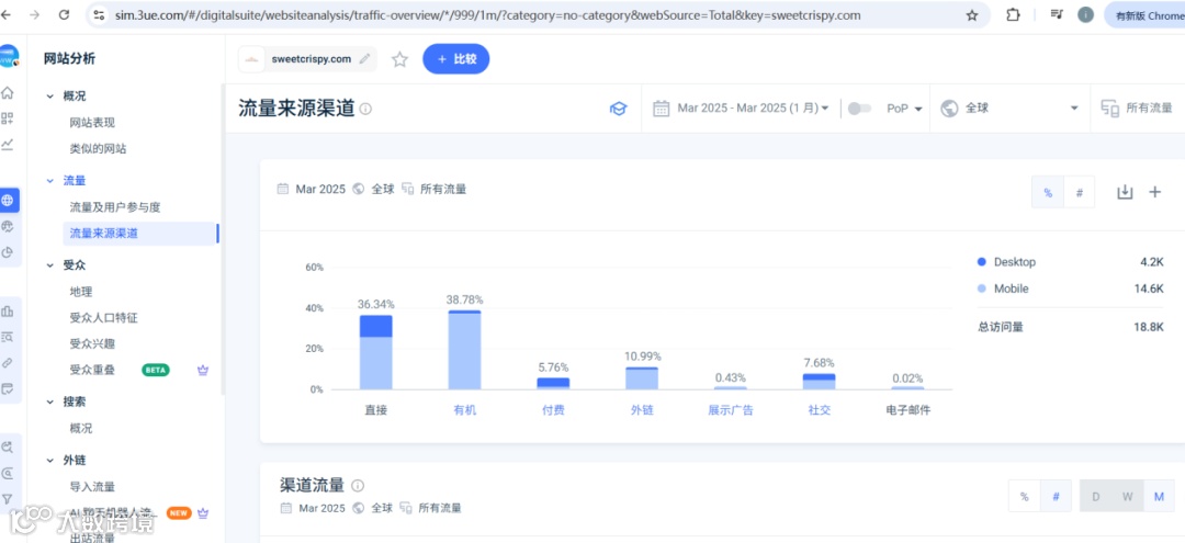 图源:Sweetcrispy数据显示,虽然该独立站月访问量不算特别高,但有近40%的流量来自自然搜索,直接流量占比也很可观。