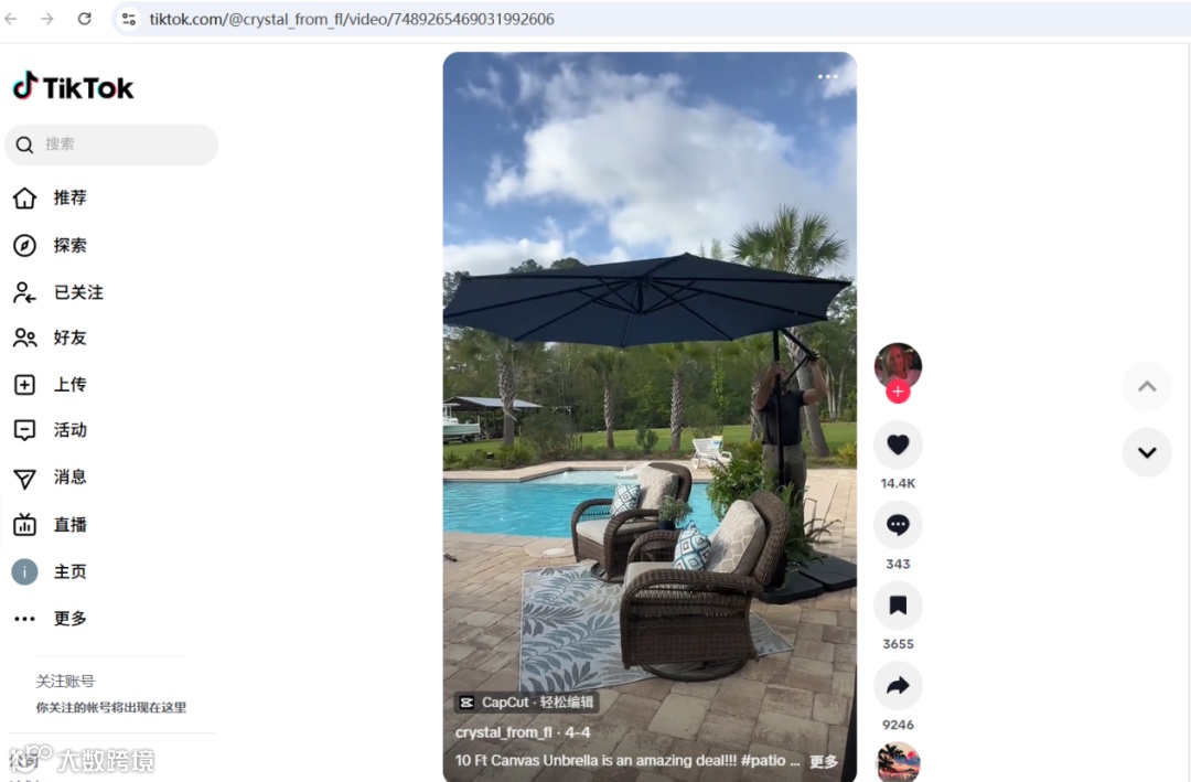但Sweet crispy公司产品线并不局限于卧室家具,还延伸到户外及宠物家居品类。TikTok Shop数据显示,旗下一款户外遮阳伞近30天月销额达300万元,位列室外家具类目销量第一。