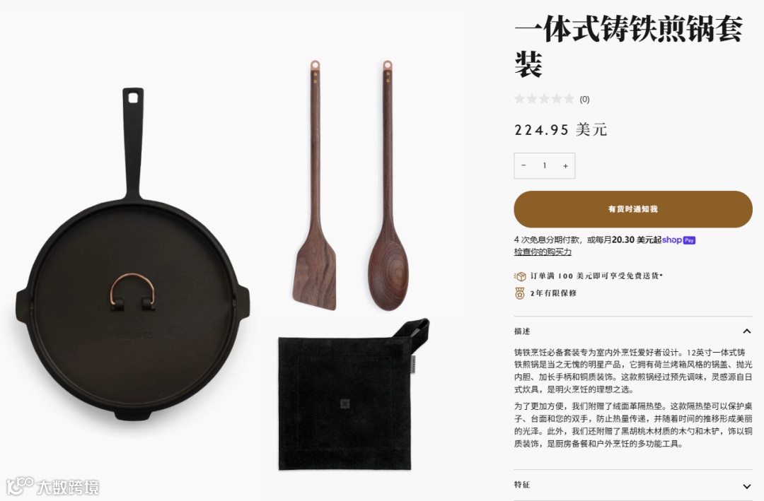 同时定位中高端,一套锅铲售价224.95美元起,通过高客单价平衡独立站流量成本,同时筛选高净值用户。