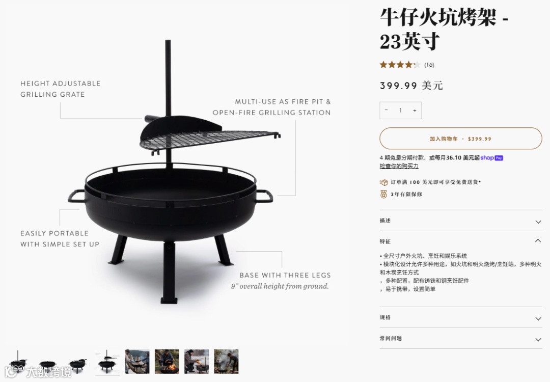 2022年推出的Cowboy Firepit Grill(三合一户外烹饪系统),整合烤架、火炉与明火烹饪台功能,采用实心钢材质与模块化设计,支持热量调节与便携拆分,满足用户从家庭后院到野外露营的多场景需求。