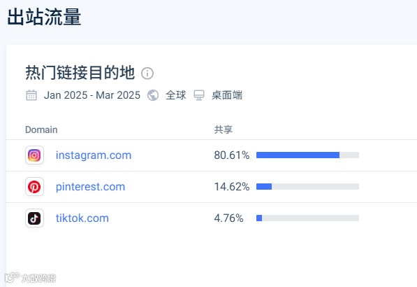 同时,与户外垂类中小KOL,包括露营博主、生存技能专家等展开社媒合作,借助真实用户的展示来推广产品,避免过度依赖明星代言。Barebones独立站出站流量中80.61%导向Instagram,其次是Pinterest和TikTok,社交媒体是核心外链渠道。