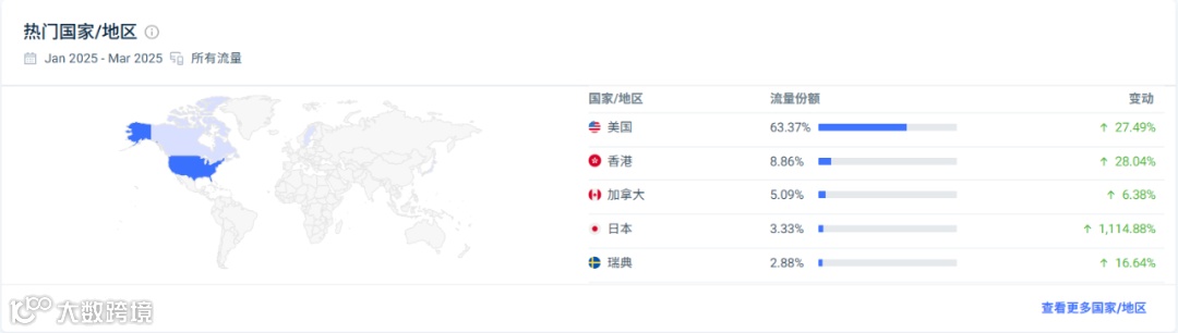 美国占据63.37%的流量份额,是绝对主导市场;日本流量增长爆发,增幅达1114.88%,可能是新兴市场机会。香港、加拿大、瑞典流量份额虽小,但增速稳定,在6%-28%之间,可作为潜在拓展区域。